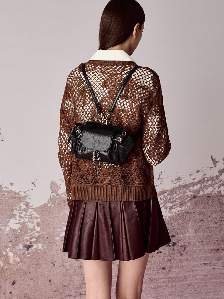 Balo Duo hai chiều vừa tiện dụng vừa thời trang. Với các túi bên hông tiện dụng và ngăn chính rộng rãi, giờ đây bạn có thể dễ dàng đựng những vật dụng thiết yếu hàng ngày. Dây đeo xích bện tông vàng tạo điểm nhấn sáng bóng, tạo nên sự tương phản nổi bật với lớp sơn kem mềm mại.